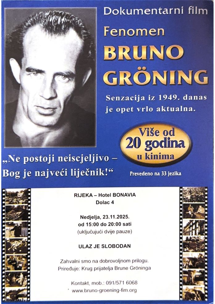 Već više od dvadeset godina u kinima širom svijeta i preveden na 33 jezika, dokumentarni film Fenomen Bruno Gröning ponovno skreće pozornost na jedan od najneobičnijih događaja 20. stoljeća. U poratnoj Njemačkoj pojavljuje se čovjek kojem dolaze bolesni, ratom iscrpljeni i od liječnika otpisani ljudi – s jednom jedinom željom: postati zdravi, oslobođeni boli i patnje.