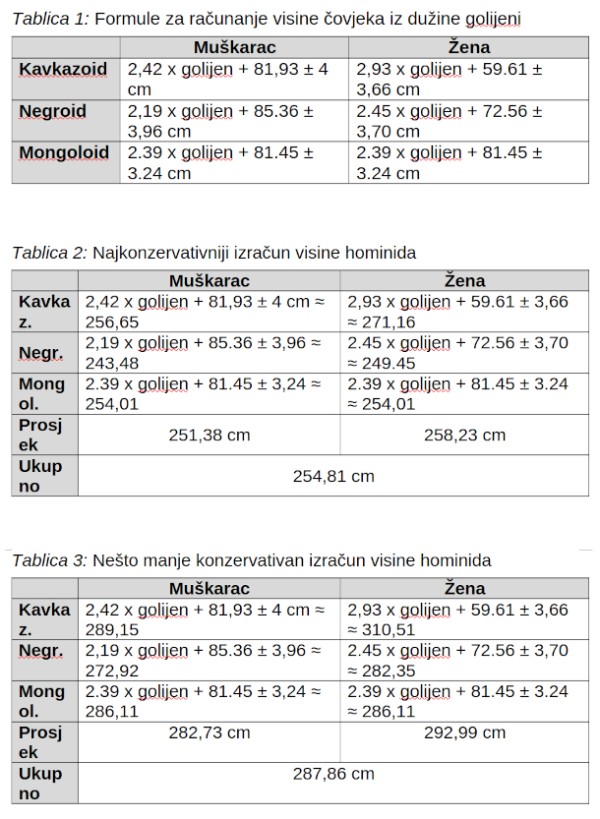 Tablica 1: Formule za računanje visine čovjeka iz dužine golijeni