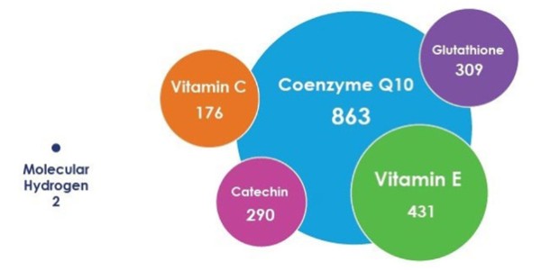 Na grafici vidimo slikoviti omjer veličine molekule vodika u usporedbi s ostalim najpoznatijim antioksidansima.